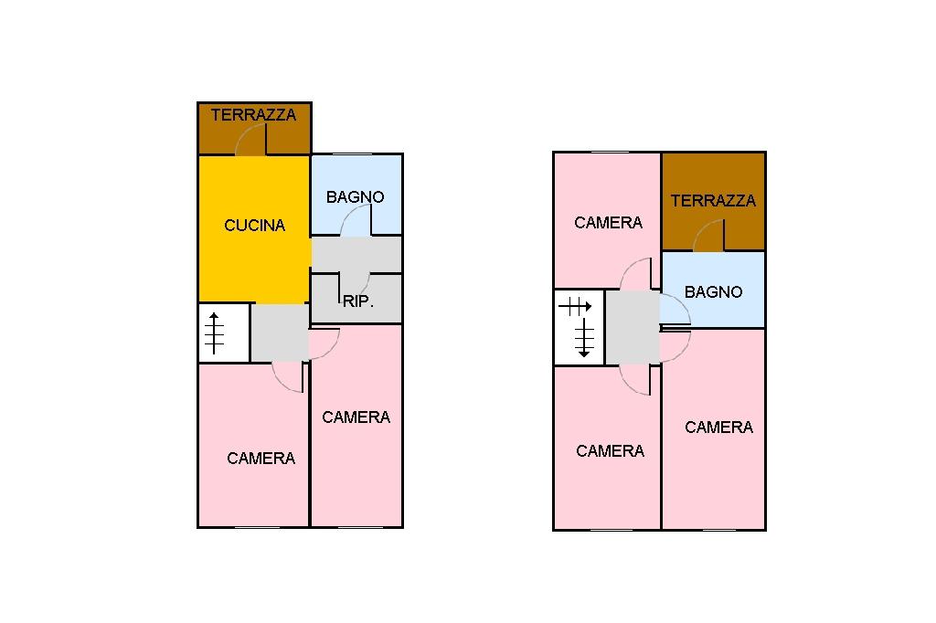 Al primo piano troviamo la cucina con affaccio sul primo terrazzo, due camere da letto matrimoniali e il primo bagno finestrato.