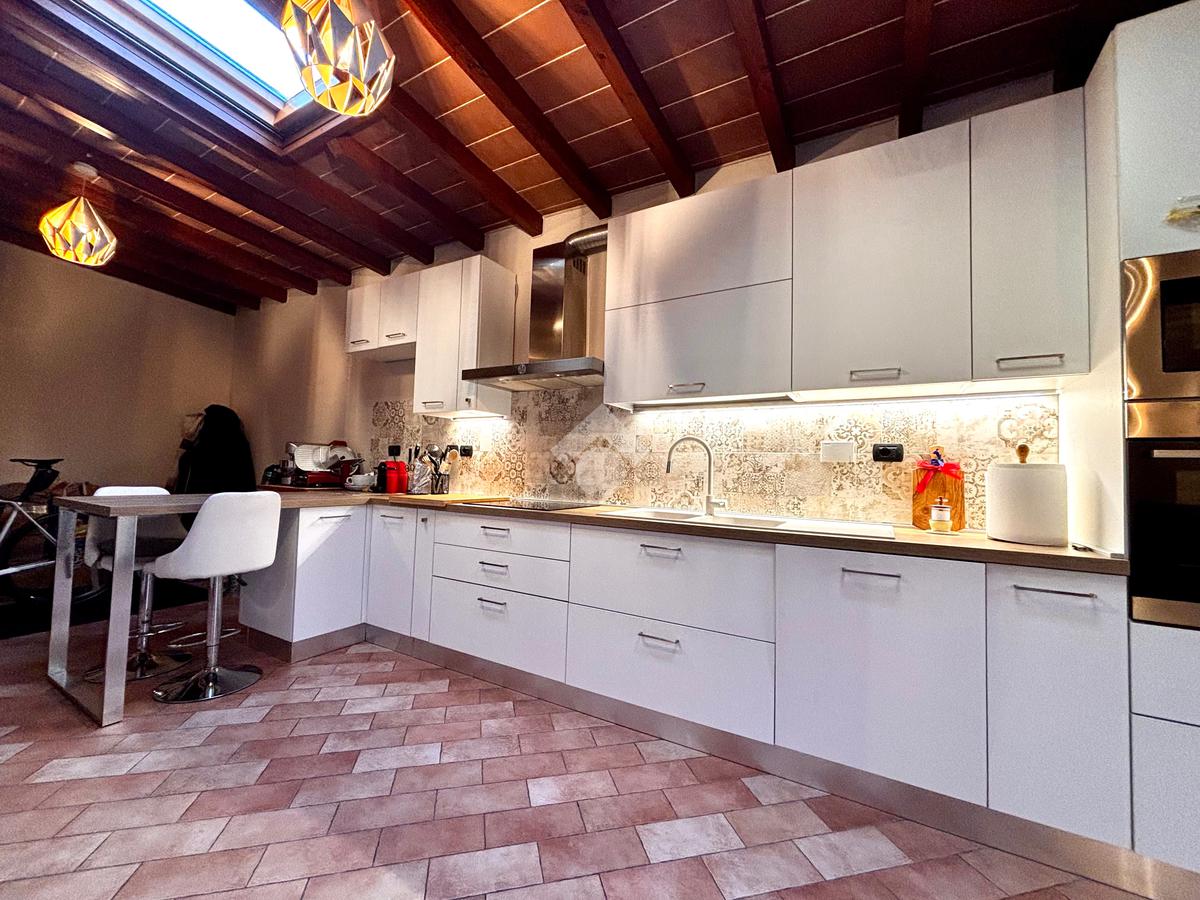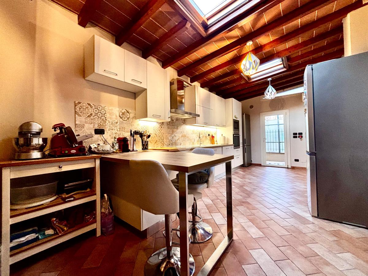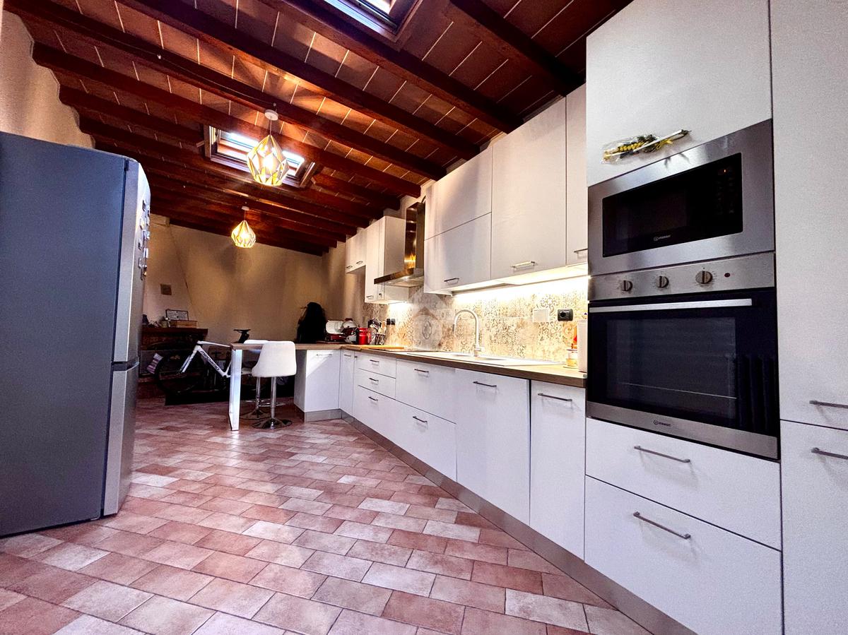 La cucina si divide nella sala da pranzo e nell'angolo cottura che è stato ricavato nella zona veranda.