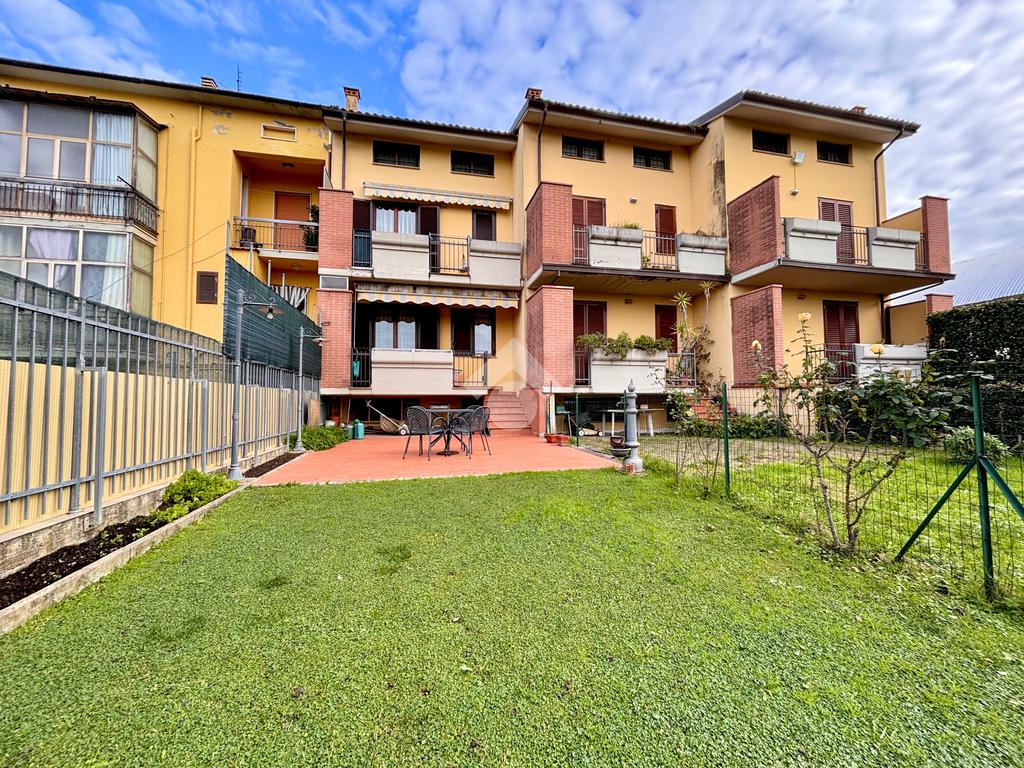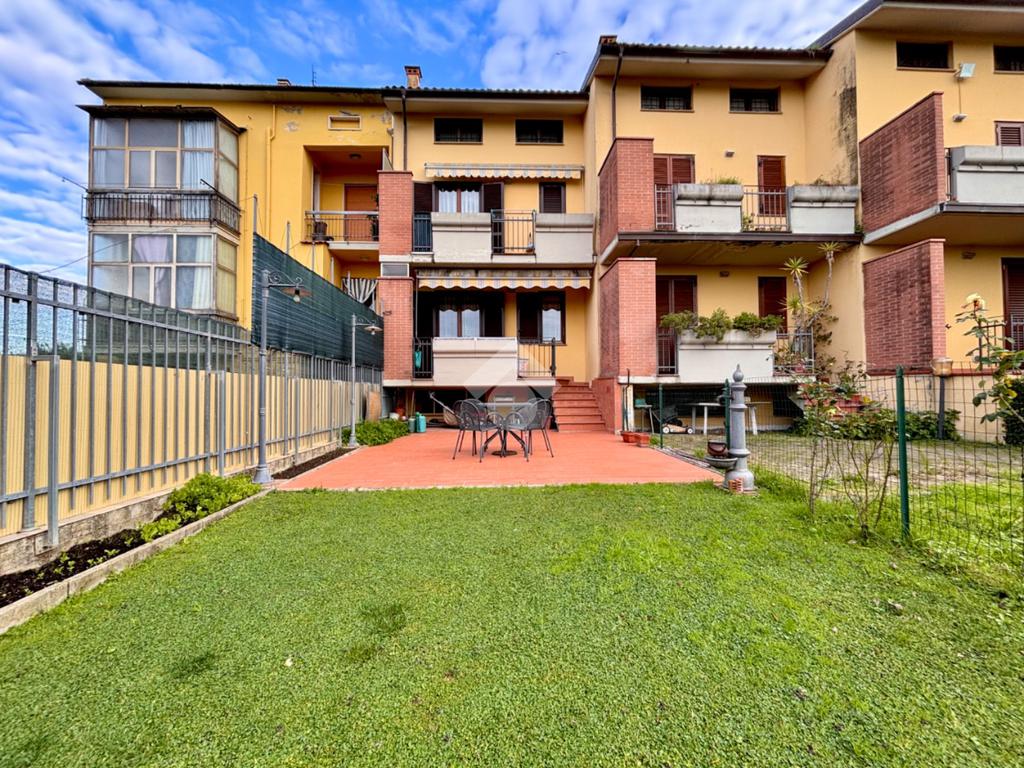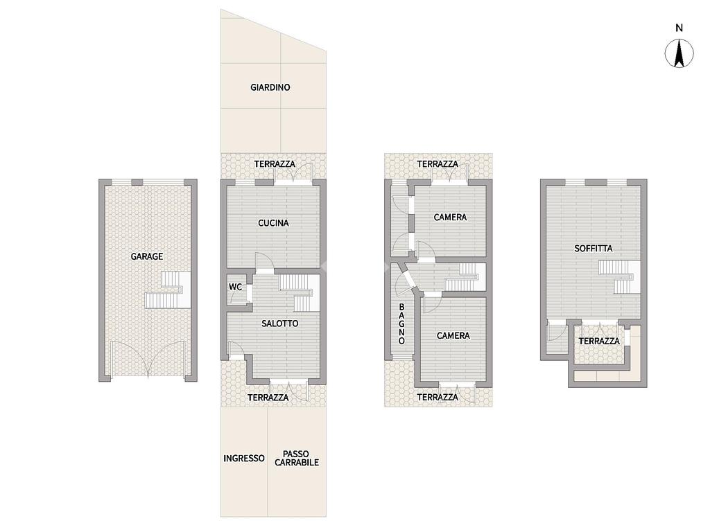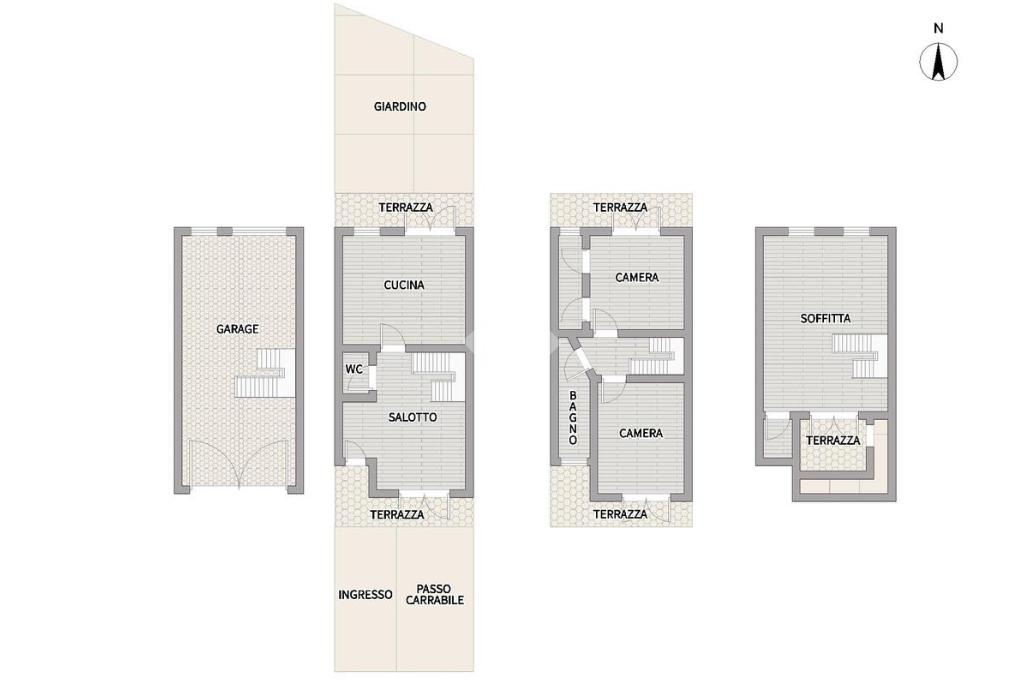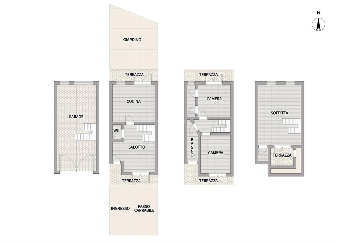 Al piano terra si trova la zona giorno con salotto, cucina abitabile e bagno di servizio. Dalla cucina accediamo al giardino tergale di 50 mq, luogo ideale per momenti di relax all'aperto.